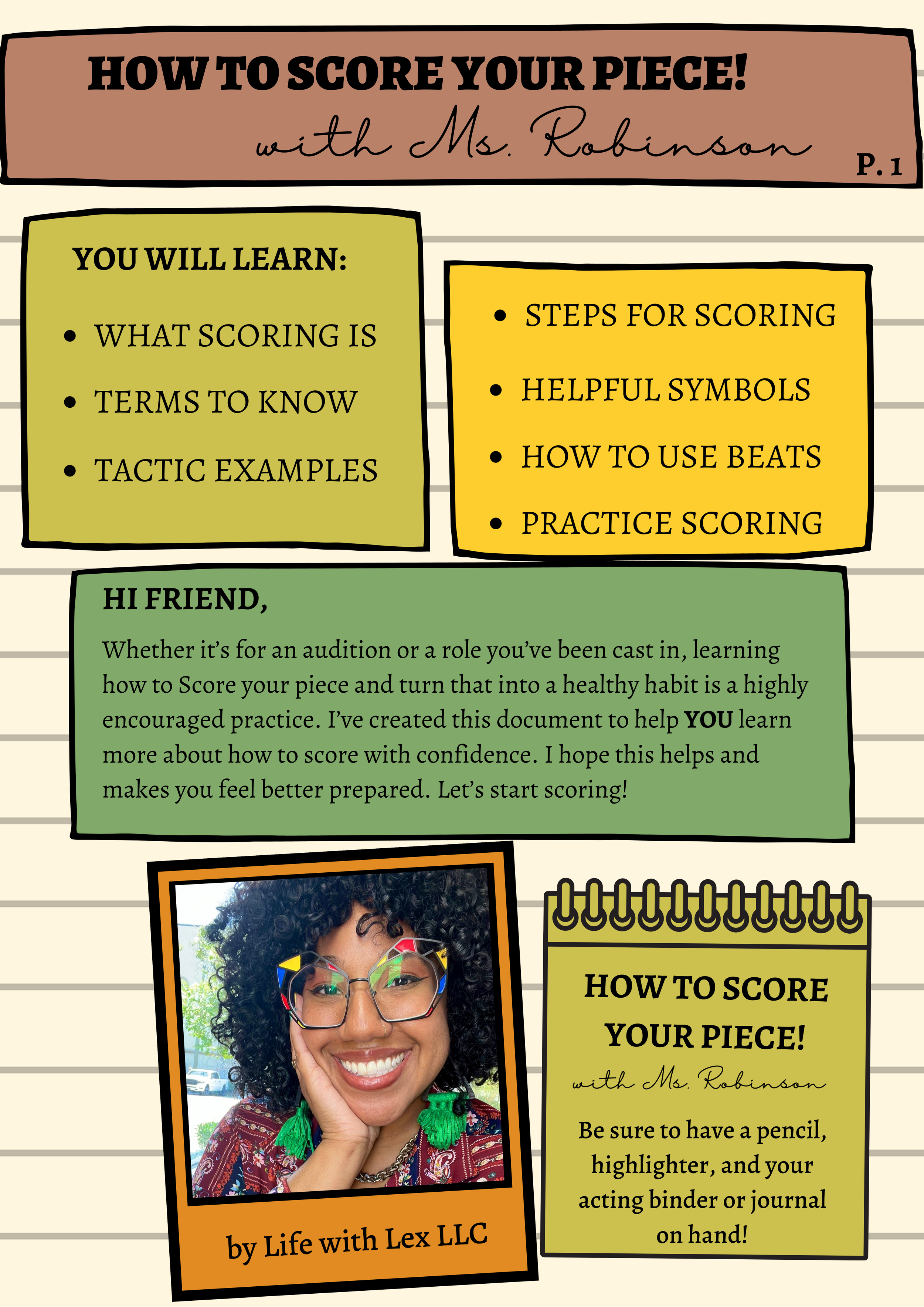 What is scoring? Why is it important for a performer to do it? How exactly do you do it? Learn what scoring is and how to properly score your song, scene, or monologue through this helpful and colorful guide! This downloadable PDF includes an example monologue excerpt and a practice scene to score. Get your copy now!